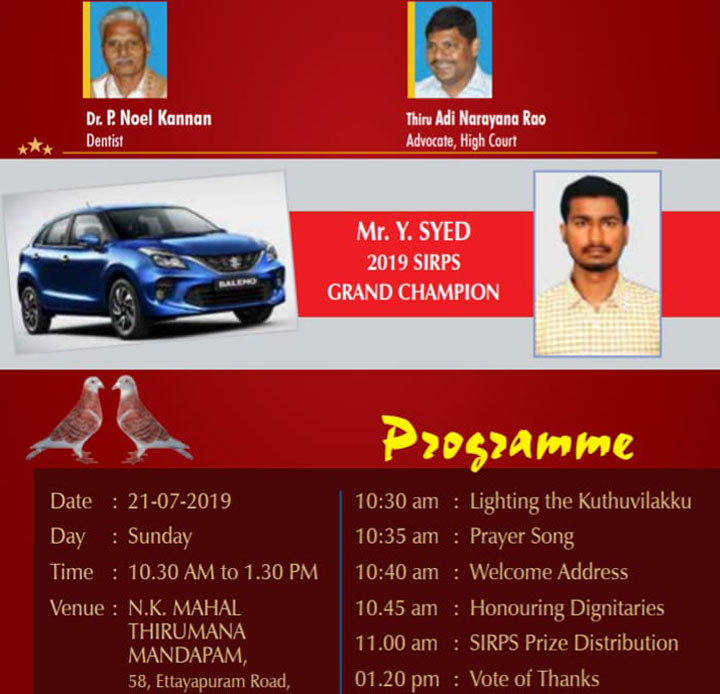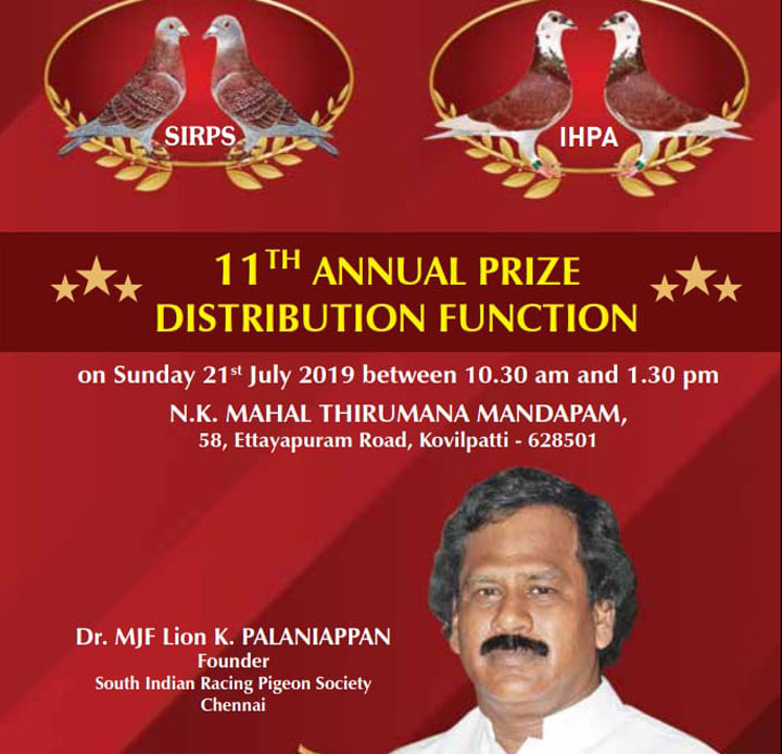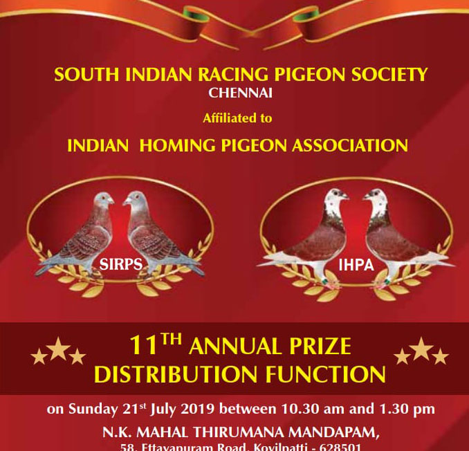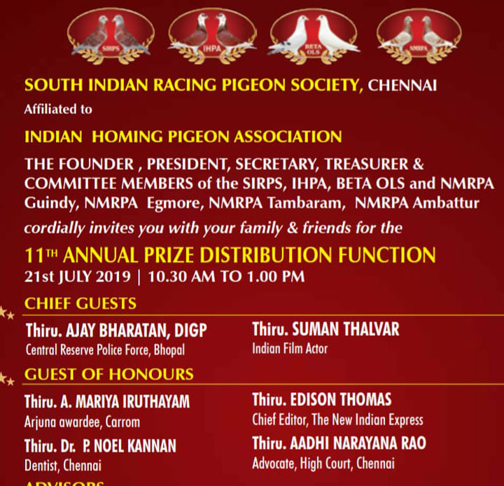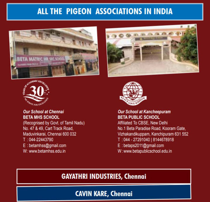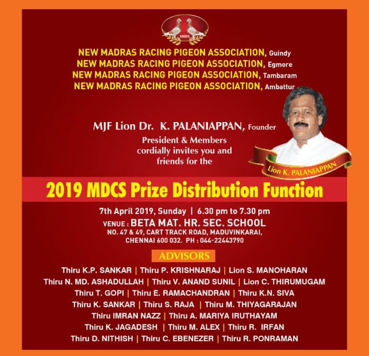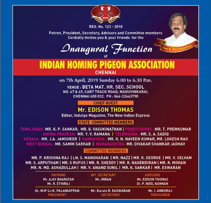 As a keen lover of pigeons I started my pigeon sports at my age of 17. In the year of 1974 at my 18th year I had become the club member of Madras Homing Pigeon Association and became the champion by 1979. I have laid the foundation of New Madras Racing Pigeon Association at St. Thomas Mount by 1984 with the strong support and Co – operation extended by Mr.P. Casey and other inmates of the pigeon association. I feel proud to say that our New Madras Racing Pigeon Association has celebrated it's Silver Jubilee at Quality Inn Safari, T. Nagar in the year 2008. More than 250 pigeons participated in this grand function. Our Club celebrated it's 26th Annual Prize Distribution function at Kamarajar Arangam along with Bi – Decennial year of Beta Matric. Hr. Sec. School on 12.02.2010 wherein more than 3000 parents & Pigeon fanciers have attended this function.